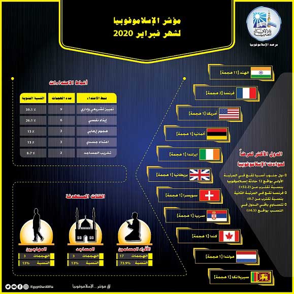 ذكر مرصد الإسلاموفوبيا التابع لدار الإفتاء المصرية أنه تم العمل على رصد وتحليل حوادث الإسلاموفوبيا الواقعة في شهر فبراير لعام 2020، حيث تم رصد (23) حادثة إسلاموفوبيا، نفذت في 11 دولة متباينة، تشهدها عدة مناطق جغرافية مختلفة من أمريكا حتى أستراليا مرورًا بدول جنوب آسيا. تتراوح بين 5 أنماط ويمثل الإرهاب أعلى مستويات الإسلاموفوبيا خطورة.